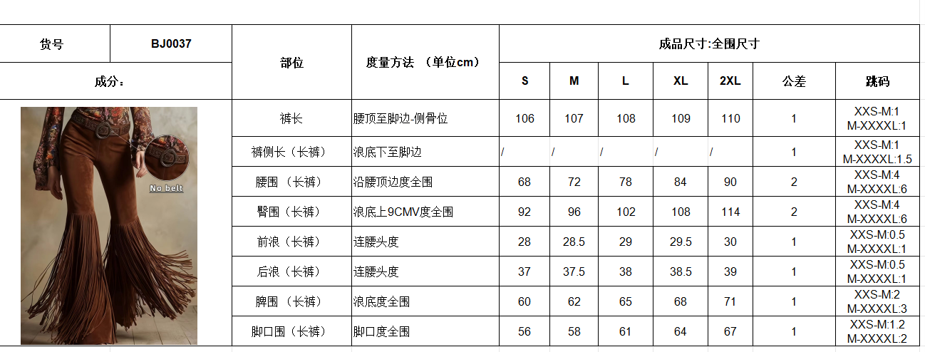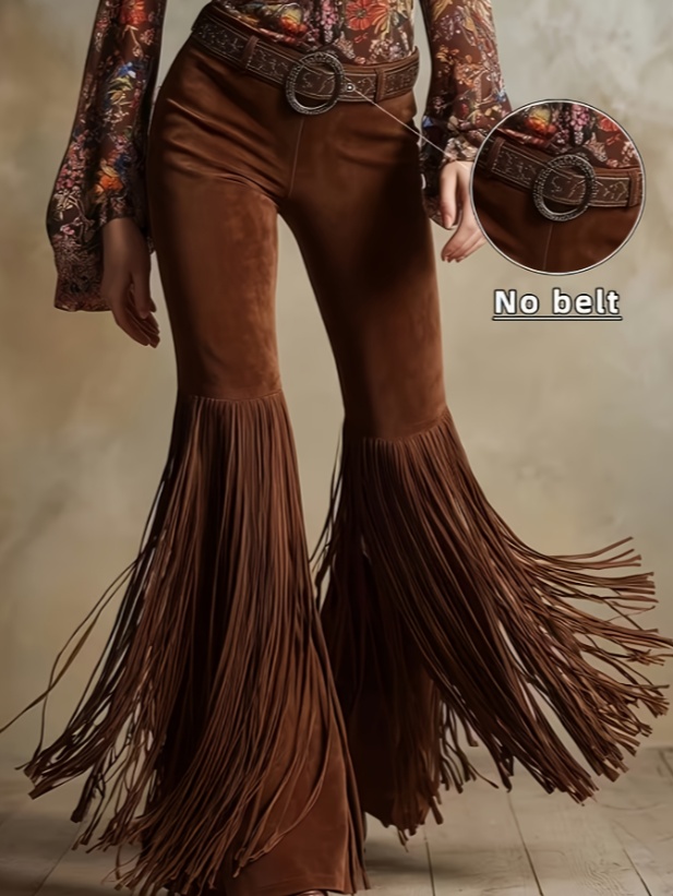 Pattern design: High-waist cut + slightly flared pants style, which optimizes the waist-to-hip ratio and elongates the leg lines; the ultra-long tassel design at the (pant hem) is full of dynamism when walking, inherently exuding a 1970s hippie and American retro atmosphere.
