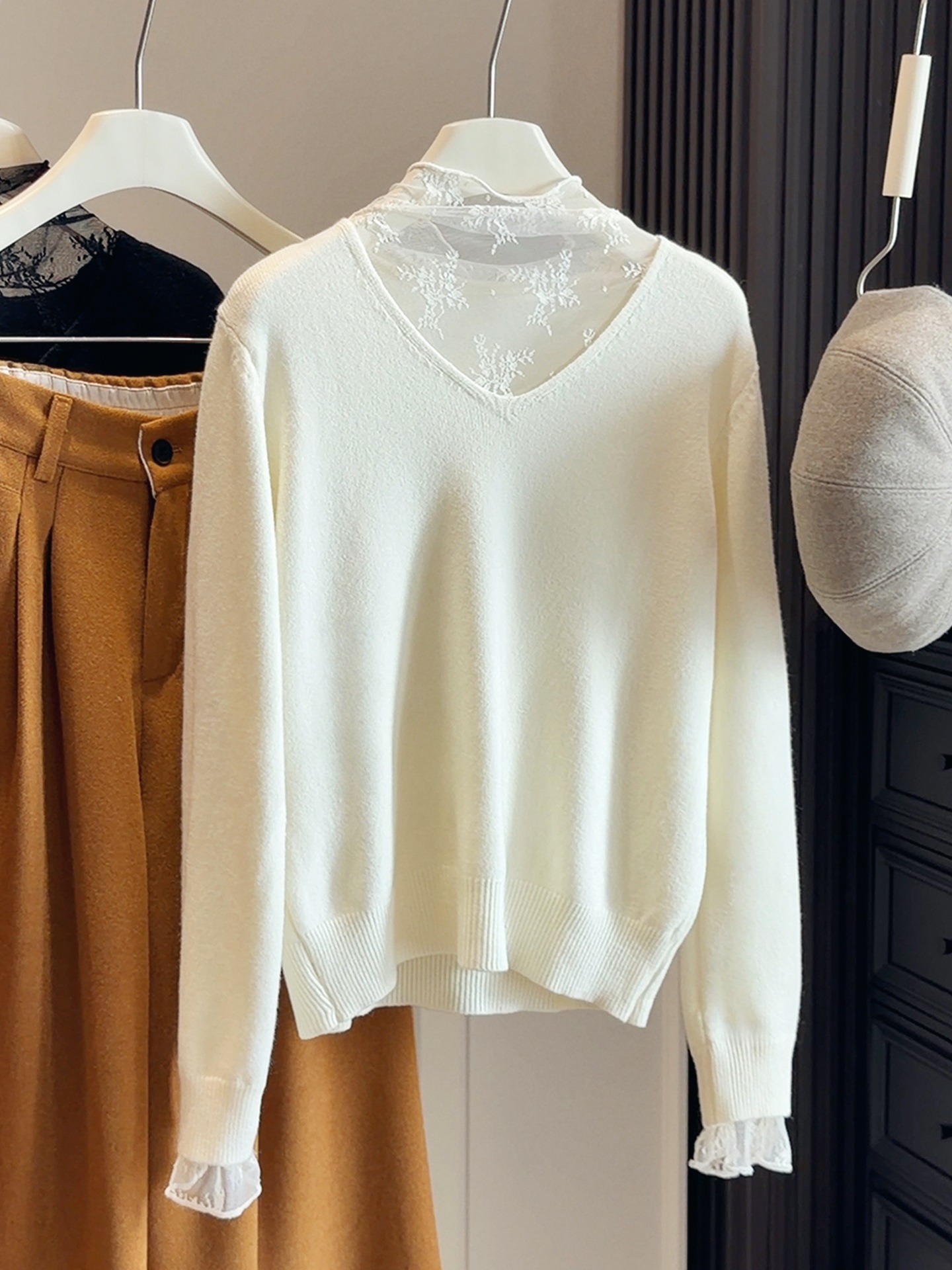 Trendy elements: Lace, solid color, knit, faux two-piece, patchwork