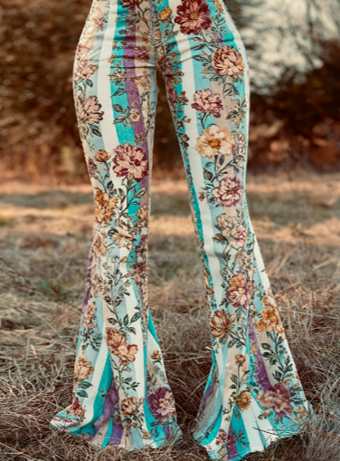 Design: White background with floral prints, combined with mint green and purple vertical stripe panels, full of retro romance