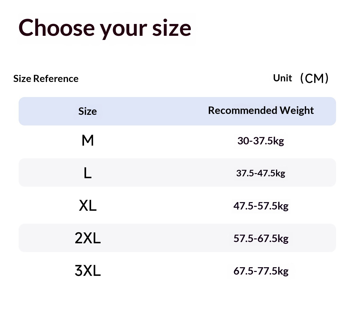 Sizes: M [recommended for 60–75 lbs], L [recommended for 75–95 lbs], XL [recommended for 95–115 lbs], 2XL [recommended for 115–135 lbs], 3XL [recommended for 135–155 lbs]