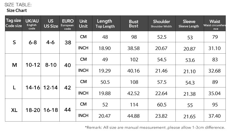 Note: 1. Asian sizes are 1 to 2 sizes smaller than European and American people. Choose the larger size if your size between two sizes. Please allow 2-3cm differences due to manual measurement. 2. Please check the size chart carefully before you buy the item, if you don’t know how to choose size, please contact our customer service. 3.As you know, the different computers display colors differently, the color of the actual item may vary slightly from the following images.